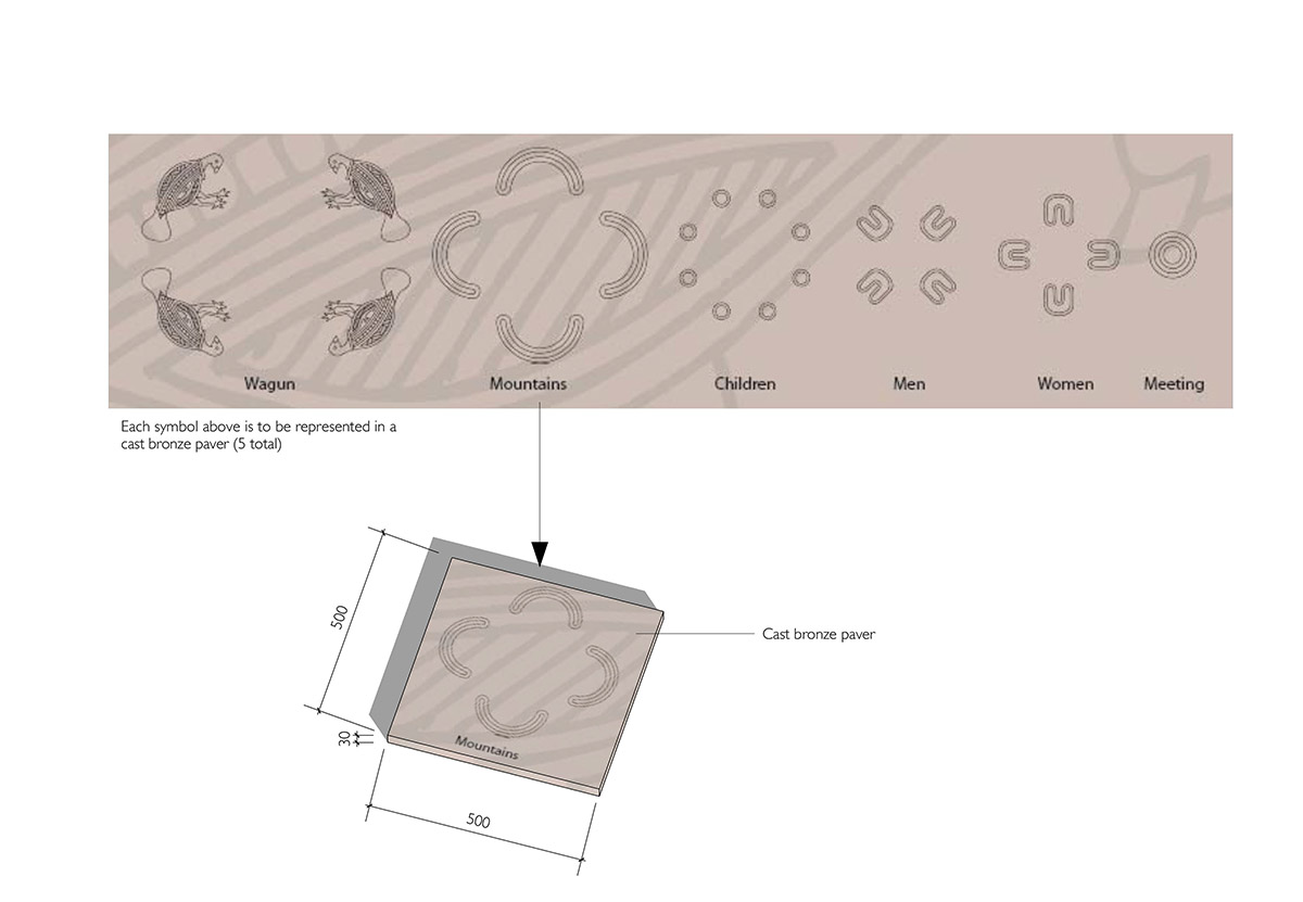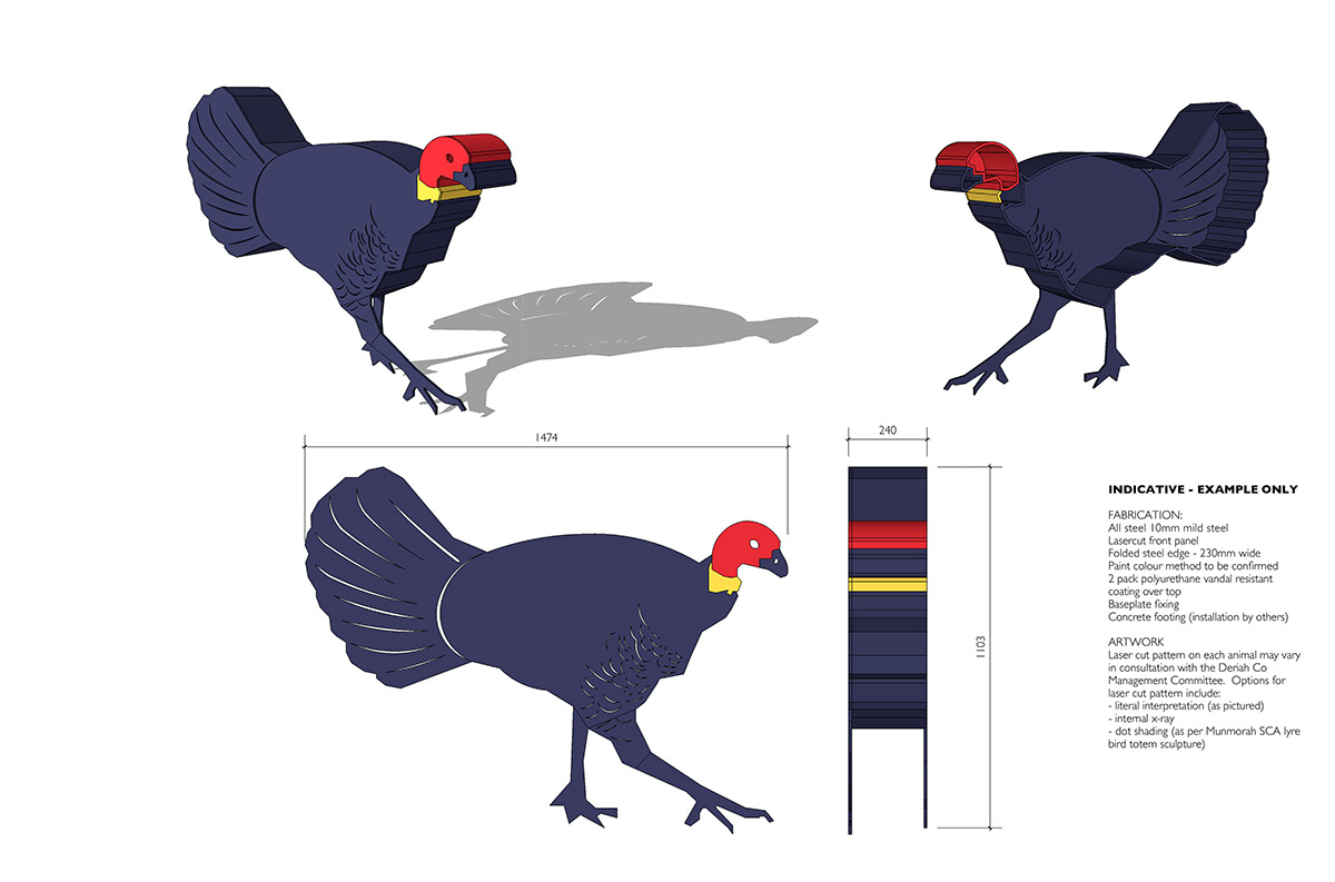 The designs included a number of large scale native animal sculptures made from folded steel plate, a stylised turkey’s nest and a series of bronze plaques that explain the meaning of the Deriah logo.