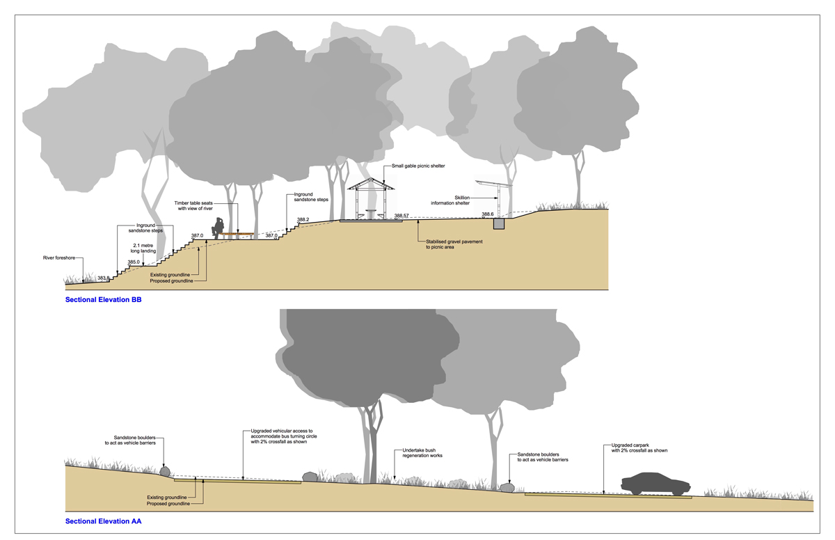 The design aims to provide better access to the river for passive recreation, hiking and includes an elevated viewing platform for the drip lookout.