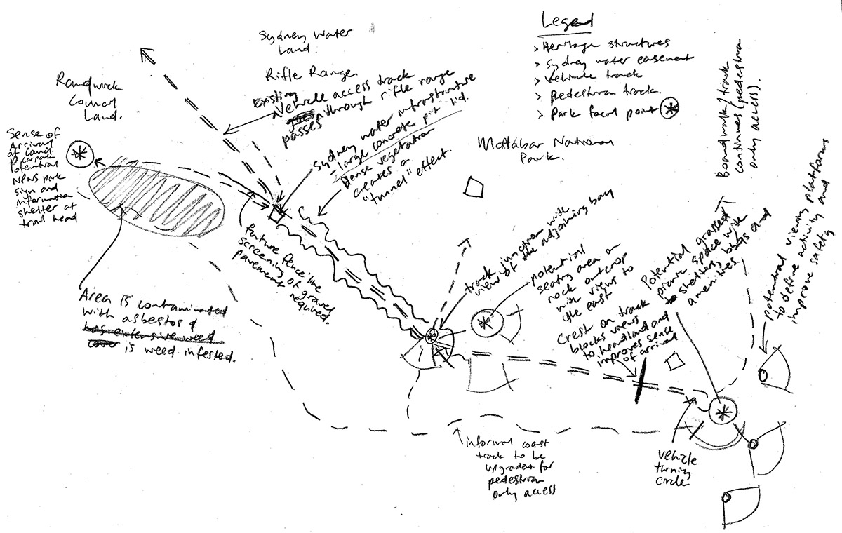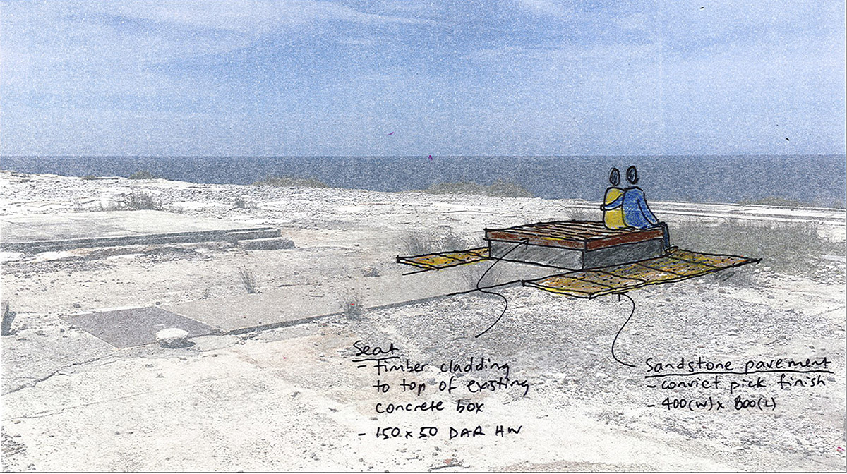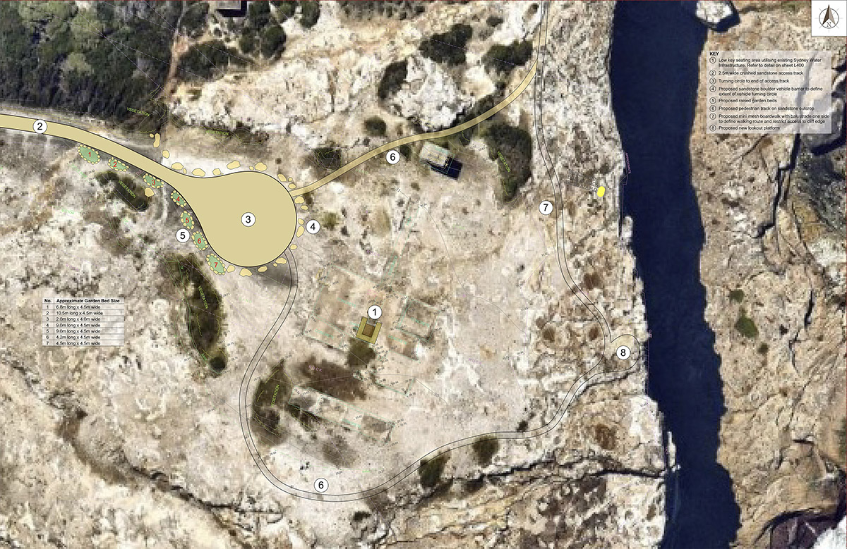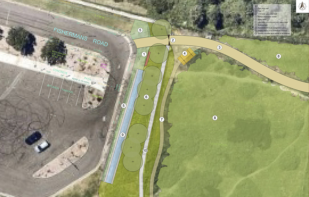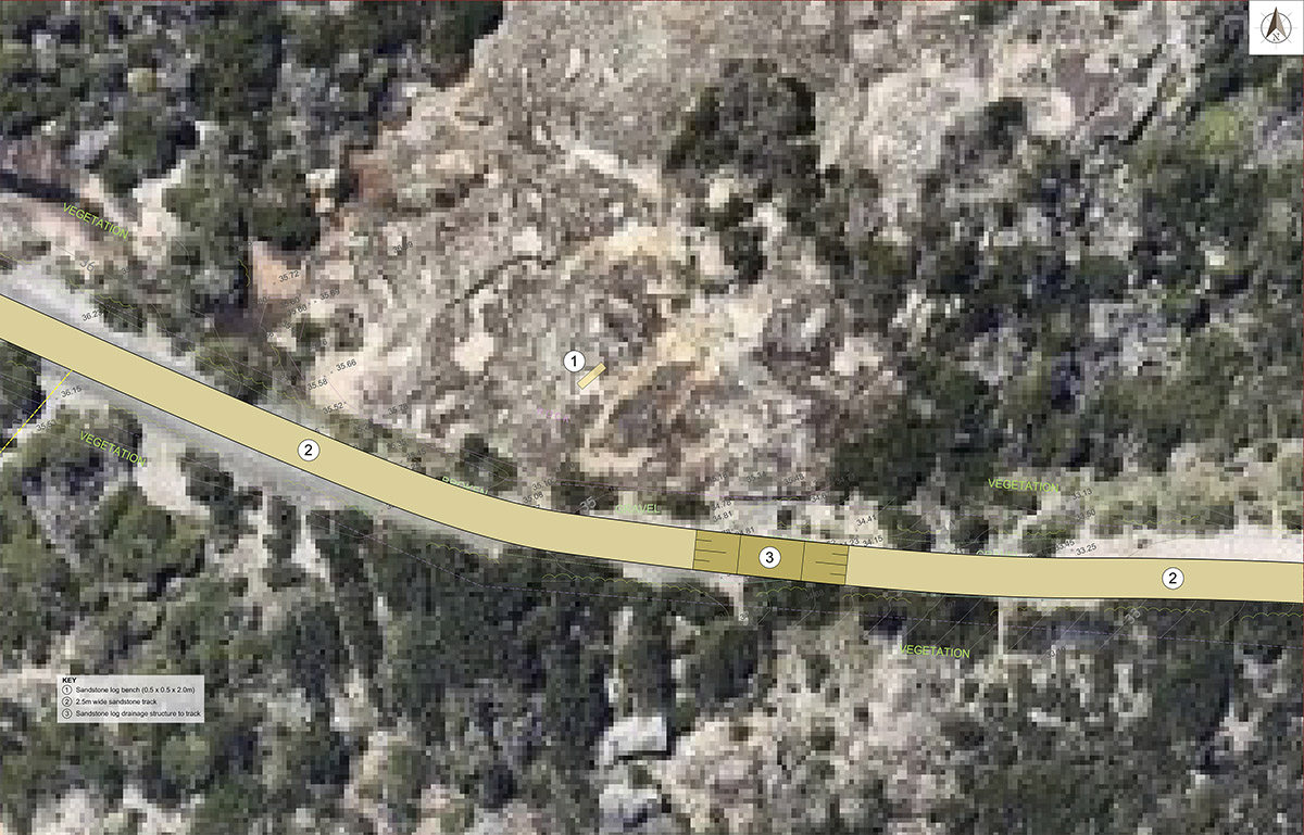 The design achieves this through the development of a visitor entry precinct at Fishermans road, including way finding and access gates. The upgrade of the access route includes provision for large trucks and sandstone erosion stabilisation, without removal of native vegetation, giving the effect of a wide walking track to visitors.
