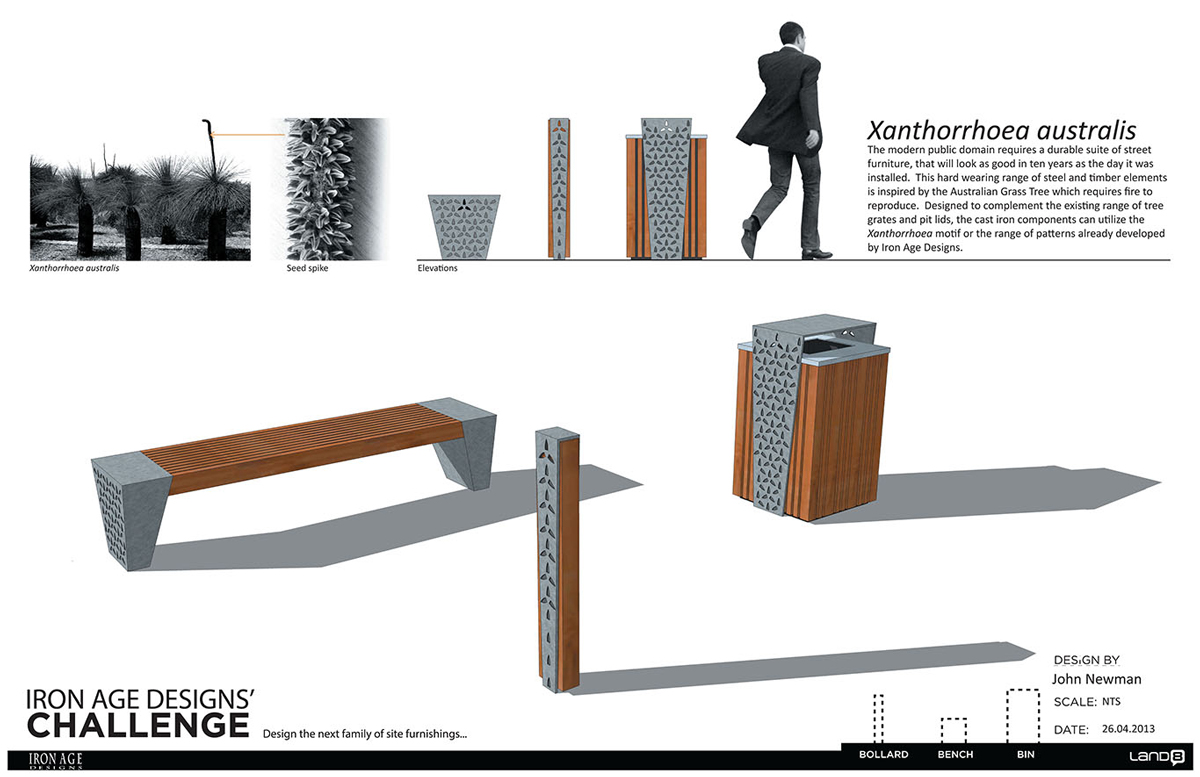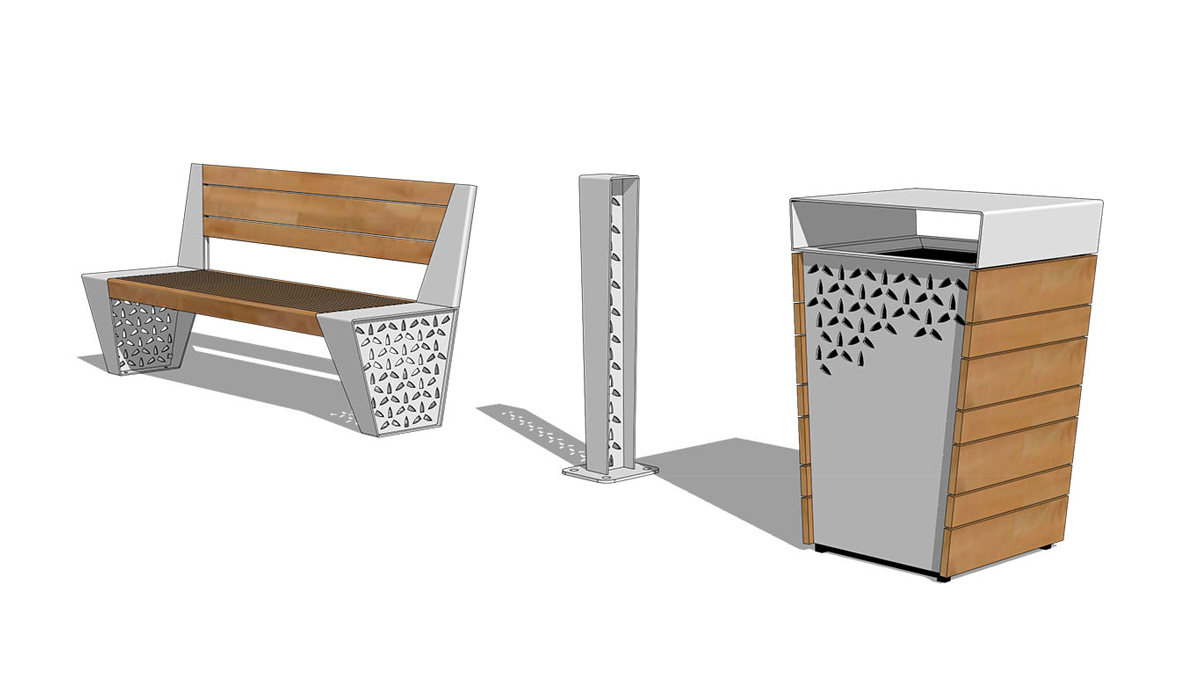 The furniture range was the winning entry in an international design competition for Iron Age Designs in the USA. NewScape Design undertook detailed design of the seat, bollard and bin elements to enable prototypes to be produced.
